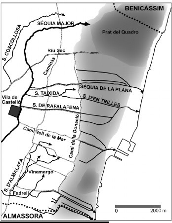La qarya de Fadrell se hallaba localizada muy cerca de la franja palustre, es decir, de la Marjalería, una extensa zona húmeda que se extendía a lo largo de 15 km de la costa, desde la sierra del Desert de les Palmes hasta la desembocadura del río Millars, incluyendo más de 2.000 ha (Fig. 3). La antigua población de Fadrell no llegaría a poner en cultivo estas zonas húmedas del litoral, pues sabemos que la desecación solo se realizó a través de la apertura de una acequia menor o canal de drenaje conocido como l’Escorredor de Fadrell (scurritorio quod dilabitur a Fadrell), hacia el cual se evacuaba el agua drenada de cada parcela por medio de zanjas o palafangues, que fue una obra de inicios del siglo XIV, es decir, inmediatamente posterior a la conquista. Su ubicación se asociaba al recorrido de la séquia d’Almalafa, un canal de riego independiente de la séquia Major, la principal acequia del sistema de irrigación andalusí de Castellón que deriva directamente de las aguas del Millars, y que también llegó a abastecer la qarya vecina de Vinamargo e incluso a la población de Almassora. Es evidente, pues, que solo tras la conquista se propiciaron los trabajos destinados a poner en cultivo el extremo sur del marjal, concretamente en el sector de las antiguas alquerías de Fadrell y Vinamargo (TORRÓ, 2010).