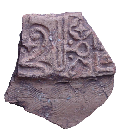 Fig. 23. Alquería de Safra: fragmento de tinaja decorada con estampillas. La pasta está poco decantada y predominan los desgrasantes gruesos. Los motivos representados son epigráficos donde se lee la eulogia al-mulk a partir de las letras alik, nexo mîm, lam y la kâf. Completa la decoración estrellas aisladas y motivos vegetales.
