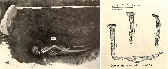 Figura 14. Tumba 34 y clavos documentados en ella (ARRIBAS, RIU, 1974: V).