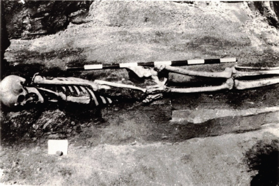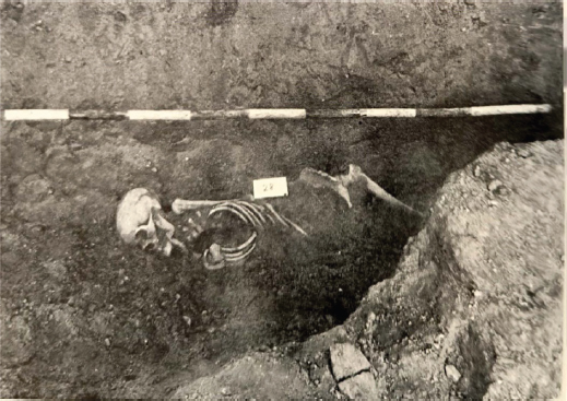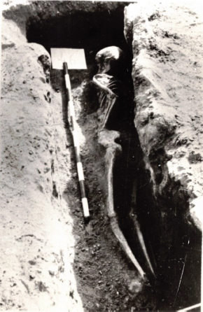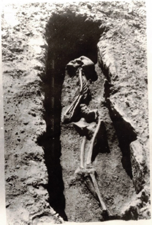 El individuo número 99 difiere del resto de la maqbara con una orientación noroeste-sureste y la disposición del cuerpo en decúbito supino, aunque la descripción y las imágenes que tenemos de este parecen indicar que estamos ante una sección laḥd (Figura 29). El autor, además de las fotografías, incluye como información gráfica dibujos a escala elaborados a mano, de las diversas tumbas excavadas (Figura 30).