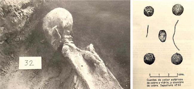 La tumba número 32 contenía una adulta joven (DU SOUICH, 1979), esta presentaba un ejemplo único de adorno personal dentro de la maqbara, se trata de un collar de cuentas de cobre y vidrio, así como fragmentos del hilo para su engarce (Figura 16) localizado sobre el cuello.