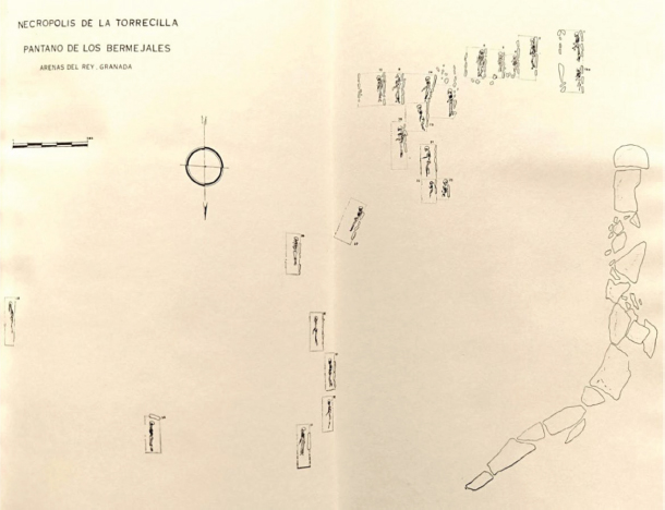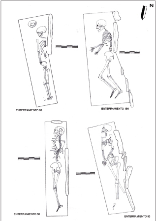 Dentro del ámbito cementerial se aprecian una serie de hileras de losas hincadas en el suelo, del cual sobresalen dispuestas en líneas paralelas orientadas de N. a S. y separadas entre sí por distancias que oscilan entre uno y dos metros […] Apoyados de espaldas a estas hileras, por su cara oriental se enterraron la casi totalidad de los individuos encontrados en los recintos a que nos referimos después, Dichas piedras constituyeron todas su protección y parecen dispuestas en fila mucho más para señalar la existencia de sepulturas y evitar su destrucción en posteriores inhumaciones, que para cualquier tipo de protección del individuo, enterrado sobre un suelo arenoso y por lo tanto movedizo (ARRIBAS, RIU, 1974: 20 y 21).