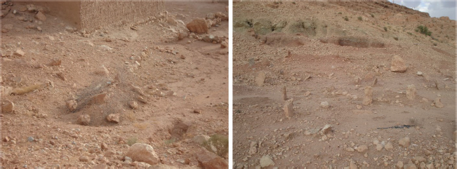 Figura 31. Maqbara de una alquería actual en Marruecos, valle del Draa, con estelas indicando la cabecera y los pies de las tumbas, posiblemente similares a las de La Torrecilla. Fotografías: María Chávet y Rubén Sánchez.
