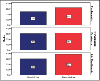 Al analizar las actividades formativas teóricas versus las actividades formativas prácticas, se aprecia un número medio de horas mayor de las prácticas que de las teóricas, más destacado en Alto Rendimiento, que en el resto de los niveles de profundización (Figura 7). Al compararlo con asignaturas de Vela, se aprecia un mismo resultado, ya que ambos deportes les dan una mayor importancia a las horas prácticas que a las horas actividades formativas teóricas. Es decir, optan por dar más contenidos en pista que en una clase (Morales et al, 2017).