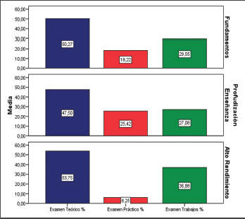 En la Figura 8, desde la perspectiva de la evaluación, se aprecia que en los tres niveles de profundización el examen teórico tiene un mayor porcentaje en la evaluación final, seguido de trabajos y, con el menor porcentaje, el examen práctico. Este examen está vinculado con criterios de observación y diseño de actividades, mientras que, en contenidos de Fundamentos, está relacionado con el desarrollo motriz.