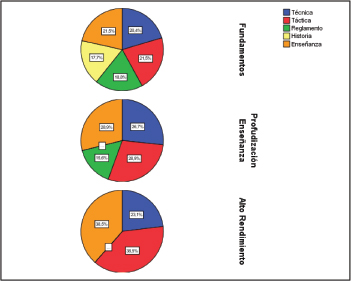 A mayor nivel de profundización, la enseñanza de los deportes apuesta por los contenidos tácticos, en la mayoría grupal, y con los procesos de enseñanza-aprendizaje, aunque no deja de lado los contenidos técnicos y de reglamento. Finalmente, en Alto Rendimiento dejan de lado los contenidos tanto de reglamento como de historia para focalizar la asignatura en la enseñanza táctica y los procesos de enseñanza-aprendizaje, ligado en menor medida del carácter técnico.
