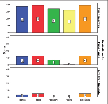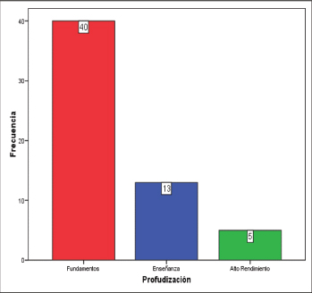 A mayor nivel de profundización, la enseñanza de los deportes apuesta por los contenidos tácticos, en la mayoría grupal, y con los procesos de enseñanza-aprendizaje, aunque no deja de lado los contenidos técnicos y de reglamento. Finalmente, en Alto Rendimiento dejan de lado los contenidos tanto de reglamento como de historia para focalizar la asignatura en la enseñanza táctica y los procesos de enseñanza-aprendizaje, ligado en menor medida del carácter técnico.