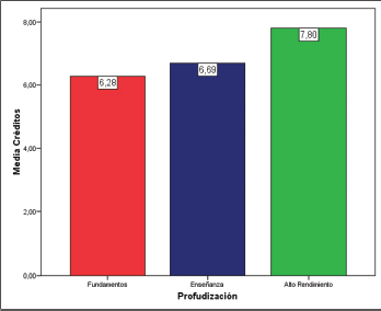 Al analizar el total de las materias estudiadas, se aprecia que la media de créditos de cada una de ellas depende de la profundización ofrecida, es decir, a mayor profundización, el número de créditos aumenta (Figura 5).