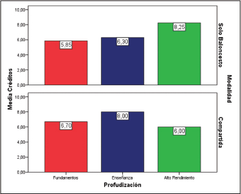 Figura 6. Créditos de las materias de baloncesto, según profundización, según modalidad