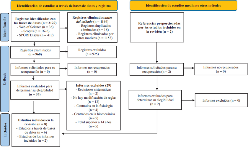 En el proceso de cribado fueron analizados un total de 960 artículos a través del análisis de los títulos y resúmenes, con el fin de seleccionar los trabajos más adecuados para esta revisión, siendo eliminados un total de 925 registros. Una vez seleccionados los 35 artículos para determinar su elegibilidad fueron excluidos un total de 29 artículos por los siguientes motivos: a) revisiones sistemáticas (2), b) no haber modificación de reglas (13), c) centrados en la fisiología (4), d) centrados en la biomecánica (5) y e) tener una edad superior a 14 años (5).