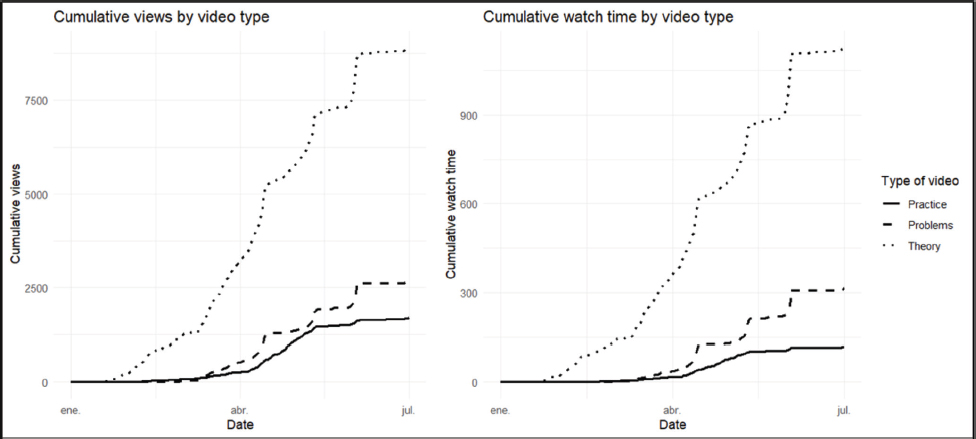 The change from face-to-face to online classes led to an increase in theory video usage across all three metrics. This type of video was the most used by students. This finding was unexpected: previous evidence associates video use primarily with exam preparation, and the exams in this course were entirely practical, including only problem-solving and application questions. Therefore it is paradoxical that theory videos were most used, even though students knew in advance that the exam would focus on problems and practice.