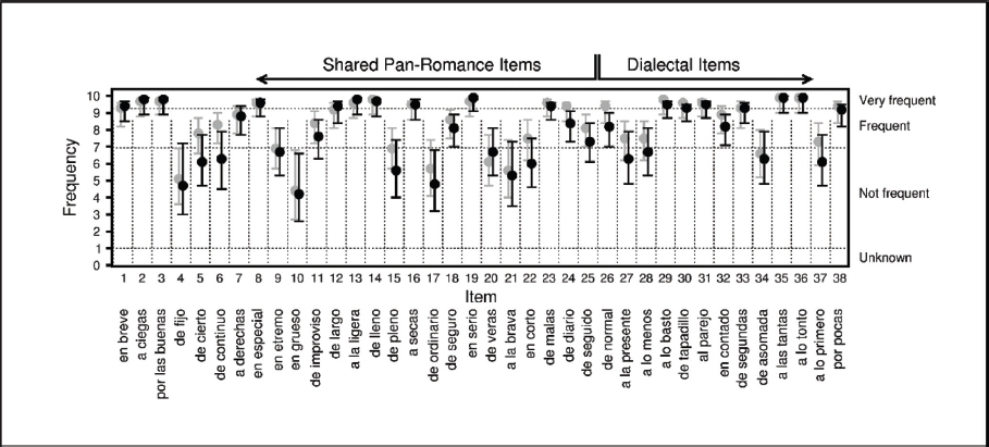 En este trabajo se analizará la frecuencia percibida de 25 esquemas P+Adj que son en buena medida panrromances y que han sido analizados de manera conjunta en el marco del proyecto The Third Way: Prepositional adverbials from Latin to Romance1, y 13 esquemas P+Adj alejados de la norma estándar del español que son de uso frecuente en el habla de Los Montes Orientales (ej. a lo basto, de normal).