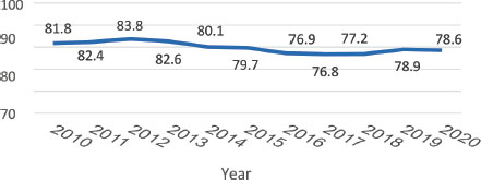 Figure 2. Percentage of extracted surface and groundwater from available water, 2010-2020