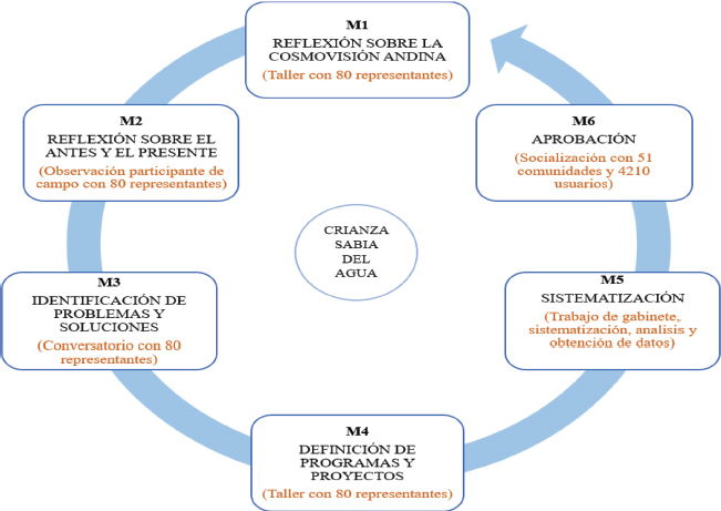 El desarrollo de la investigación para la construcción del plan o la armonización de la gestión del riego se llevó a cabo a través de seis momentos: (i) reflexión sobre la cosmovisión andina; (ii) análisis del pasado y la situación actual de la organización; (iii) identificación de problemas y propuestas de solución; (iv) definición de programas y proyectos; (v) sistematización; y, (vi) aprobación del plan de gestión comunitaria para la crianza sabia del agua.