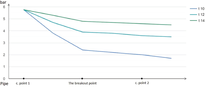 As a result, the expected point of pipe rupture associated with corrosion was determined. The calculations were carried out taking into account the user’s water intake at different hours of the day (t 10, t 12 t 14).