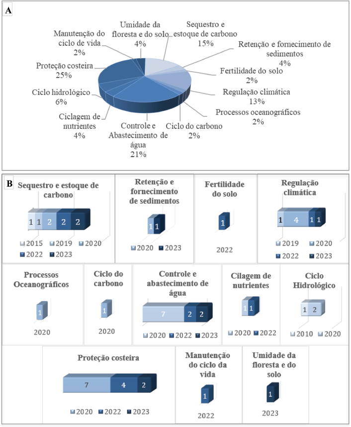 No geral, a conexão envolvendo o bem-estar costeiro e os ecossistemas está tornando-se mais perceptível através das aplicações in situ, como em parceria com as organizações governamentais e não-governamentais e da visibilidade de publicações científicas15. A nivel global pesquisas dessa profundidades são vistas em produções sobre o avanço do conhecimento dos SE16, sinalizando o aumento exponencial de artigos relacionados ao tema entre os anos de 2004 a 2013, contabilizando de 100 para 6.330, respectivamente. Ao especificar os SE costeiros, mais de 50 serviços ecossistêmicos foram notificados, sendo “alimentos” e “valores recreativos” os serviços mais estudados no período de 2014 e 2018 e os Estados Unidos lidera as pesquisas mundiais, abarcando 40 % dos estudos17. Europa foi a região mais produtiva e o Brasil está inserido entre os 10 paises de maior produção científica, registrando 59 documentos até o ano de 2022, com áreas de estudos concentradas na região sudeste18. Na esfera brasileira não foram encontrados estudos bibliométricos, contudo vale ressaltar a pesquisa sobre o risco de perda de serviços ecossistêmicos devido às mudanças climáticas, na costa sul19.