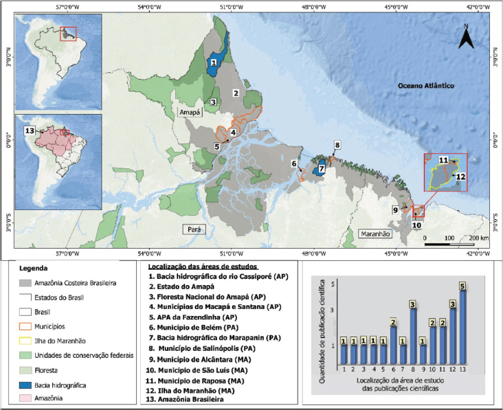 Figura 2. Espacialização das áreas de estudos das produções científicas sobre serviços ecossistêmicos relacionados aos ambientes costeiros da Amazônia brasileira