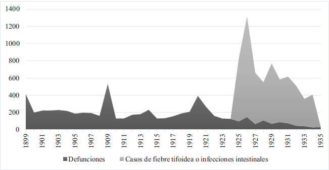 El recurso al agua de los viajes para sortear las turbias o en momentos de restricción del suministro ocasionados por graves averías en las infraestructuras del Canal, provocó repuntes de casos de fiebre tifoidea, enfermedad infecciosa que tenía carácter endémico en Madrid, como en gran parte de las ciudades españolas en este periodo54. Así sucedió al menos en 1899, 1909, 1912, 1919, 1920, 1921, 1924 y 1931, años en los que se elevó el número de enfermos por esta causa, coincidiendo con el aumento del consumo de aguas de los viajes antiguos (Figura 6), achacándose a su contaminación el recrudecimiento de la tifoidea. Sin embargo, por más críticas y quejas de la ciudadanía, de la prensa y de las autoridades médicas, particularmente de los médicos higienistas, quienes acudían periódicamente a los diarios para excitar la necesidad de tomar medidas para mejorar la calidad de las aguas de Madrid, la situación no mejoraba. Entre las acusaciones más duras puede citarse la que en 1904 realizó el doctor y concejal inspector de higiene y sanidad Luis Ortega-Morejón. Bajo el expresivo título “Las aguas de Madrid. Responsabilidad criminal por omisión”, escribió en el popular Heraldo de Madrid: “… me decido a enterar a todo el vecindario de que el agua de Lozoya es venenosa; que la mayor parte de las tifoideas, por no decir todas, dependen de esta causa, y así tenemos innumerables enfermos rellenando nuestros hospitales”55.
