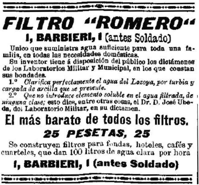 Las familias más acomodadas podían costearse filtros domésticos (Figura 5) y en caso de turbias fuertes, adquirir aguas de mesa embotelladas. El resto de la población se veía forzada a surtirse del imprescindible líquido en las fuentes públicas abastecidas por los viajes antiguos. Como ya se ha dicho, ofrecían agua sin tratar, muy expuesta a la contaminación en el subsuelo por la deficiente red de saneamiento de la ciudad. Los diarios son prolijos en crónicas sobre las largas colas y frecuentes altercados que se producían en torno a estas fuentes servidas por los viajes cuando había escasez de líquido o turbias prolongadas. Aunque las autoridades solían recomendar hervir y airear el agua destinada a bebida, pocas familias lo hacían. En el caso del agua turbia del Canal, esta operación hacía desaparecer los agentes patógenos, pero no suprimía el mal sabor ni la turbidez, lo que la hacía repugnante al gusto53.