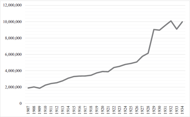 Figura 3. Ingresos del CYII por abastecimiento de agua en Madrid, 1907–1934, en pesetas