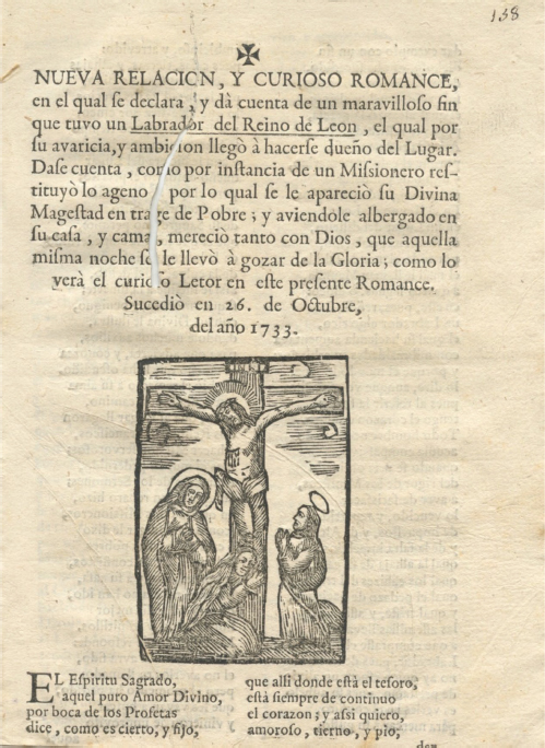 Figura 1. NUEVA RELACION Y CURIOSO ROMANCE en el qual se declara, y da cuenta de un maravilloso fin que tuvo un Labrador del Reino de León...Sucedió en 26 de octubre del año 1733. Sin imprenta ni año.